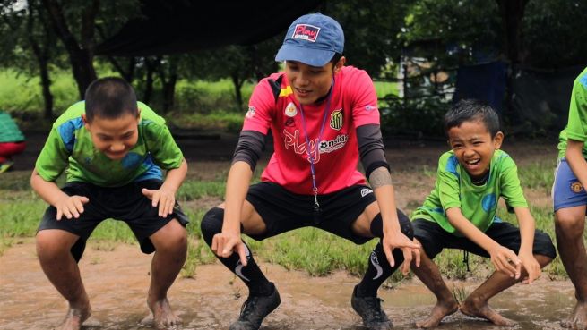 In einem Camp in Thailand kommen junge Menschen aus verschiedenen kulturellen Hintergründen zusammen, und spielen Fußball.