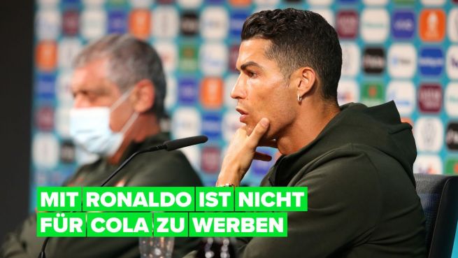 Sichtlich angeekelt lässt Cristiano Ronaldo zwei Cola-Flaschen bei einer EM-Pressekonferenz verschwinden